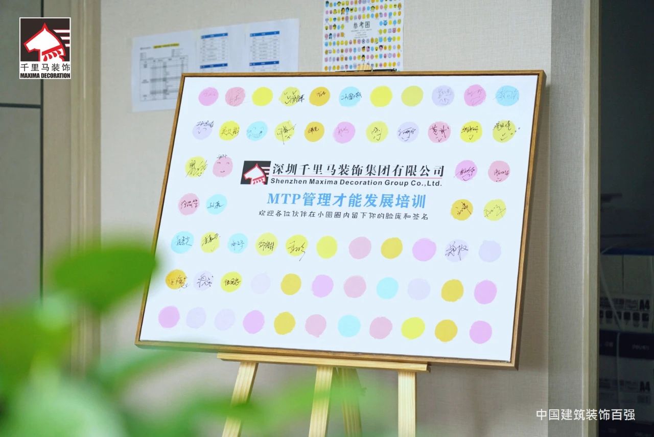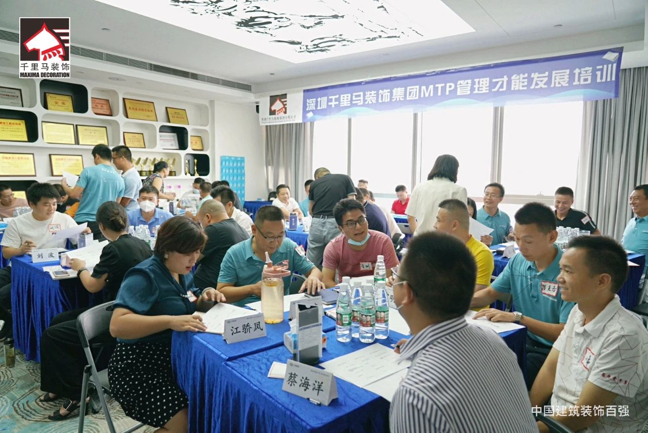 邁進會議室,迎面而來的是擺放得整整齊齊的藍色課桌,抬頭看,清新怡人的藍白色相間的橫幅映入眼簾——“深圳千里馬裝飾集團MTP管理才能發展培訓”,原來是為了提升中層管理